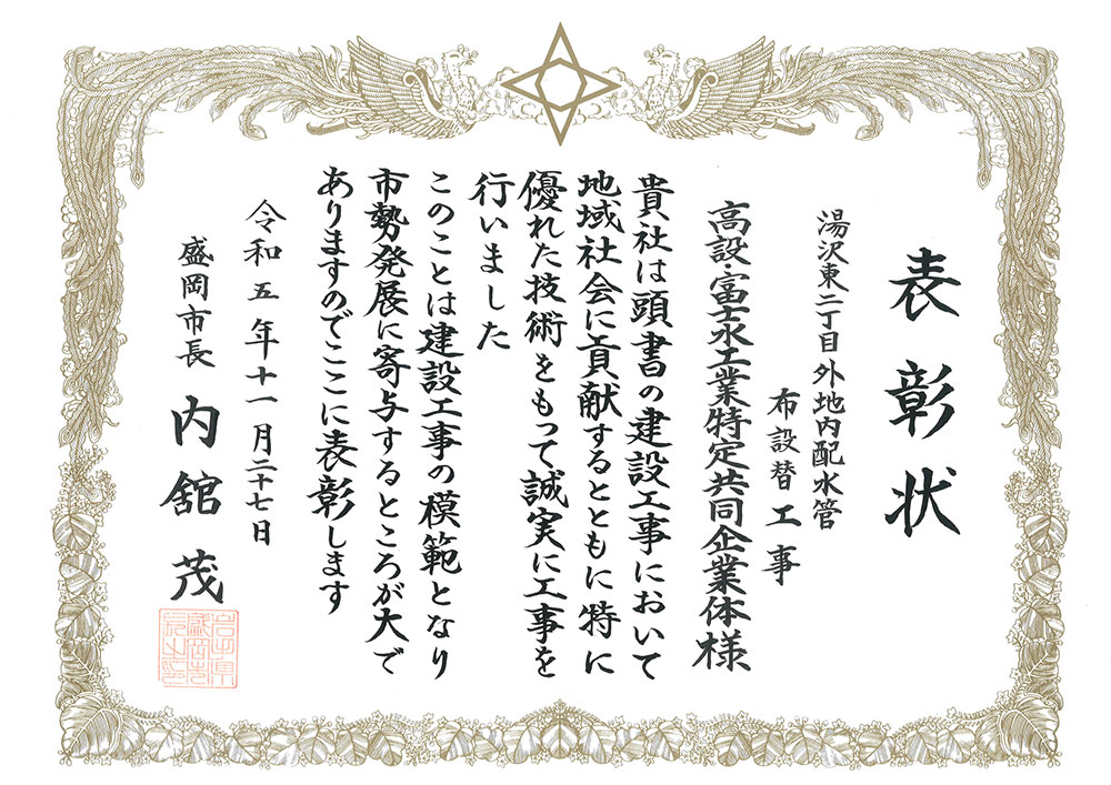 2023年11月27日プラザおでってにて令和5年度盛岡市優良建設工事表彰式が行われ、「高設・富士水工業特定共同企業体」が施工した『湯沢東二丁目外地内配水管布設替工事』が選出されました。
